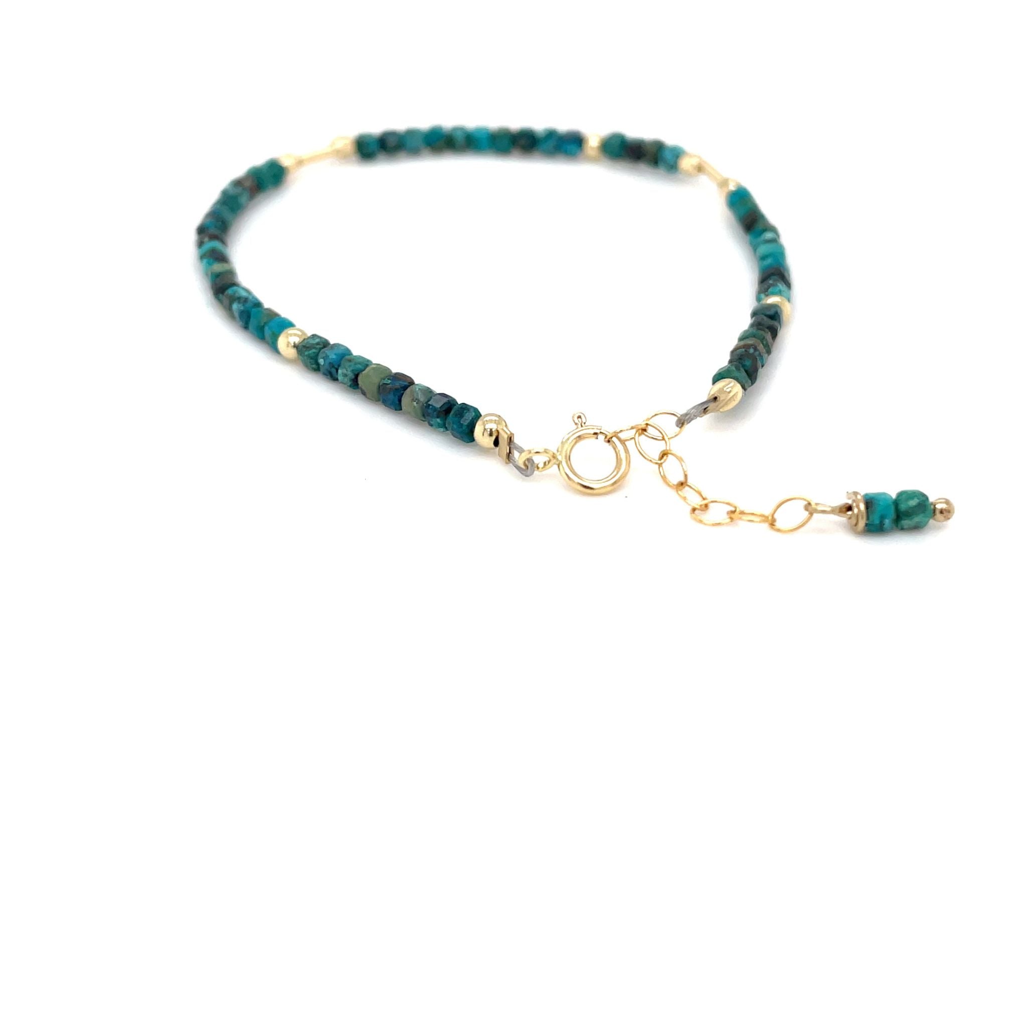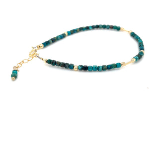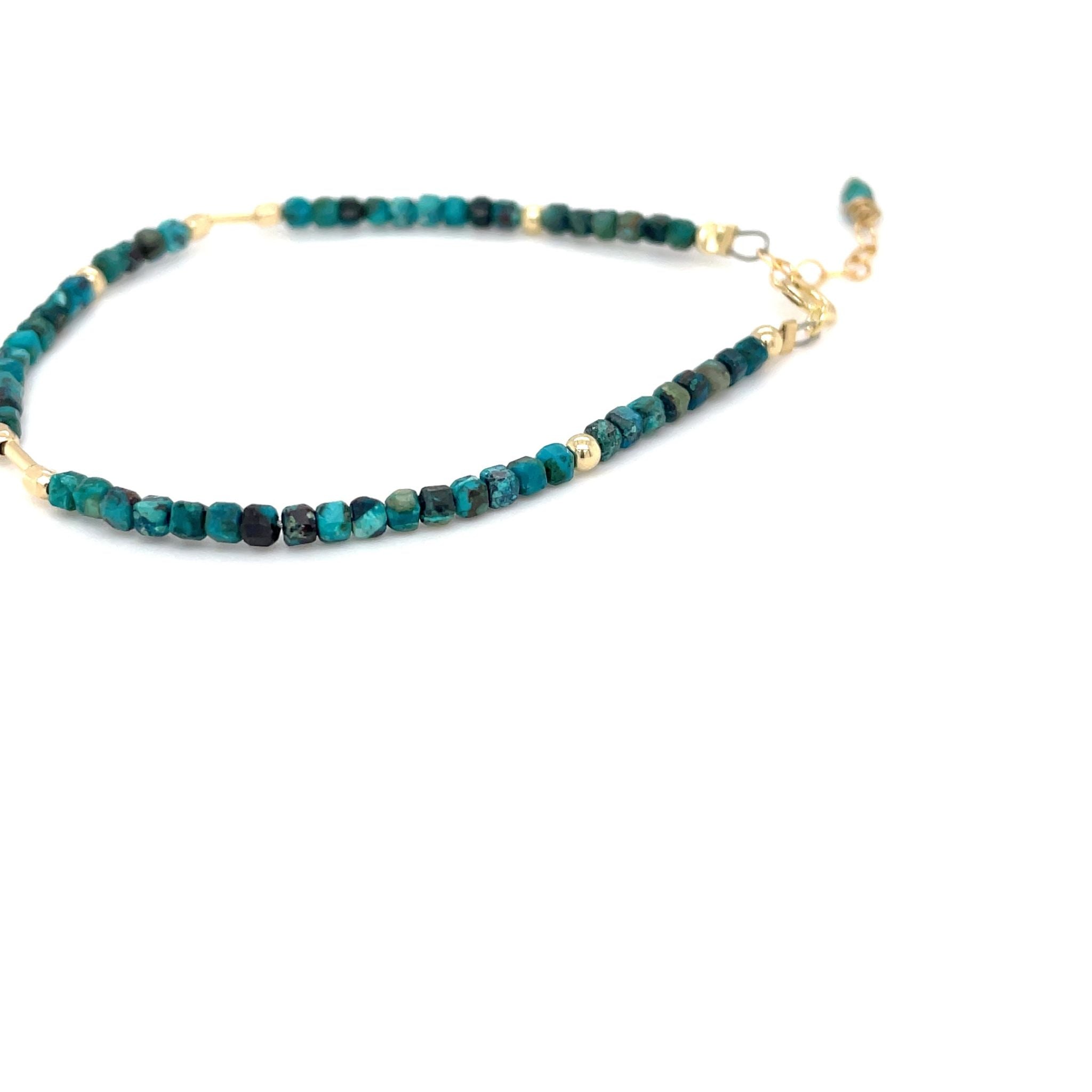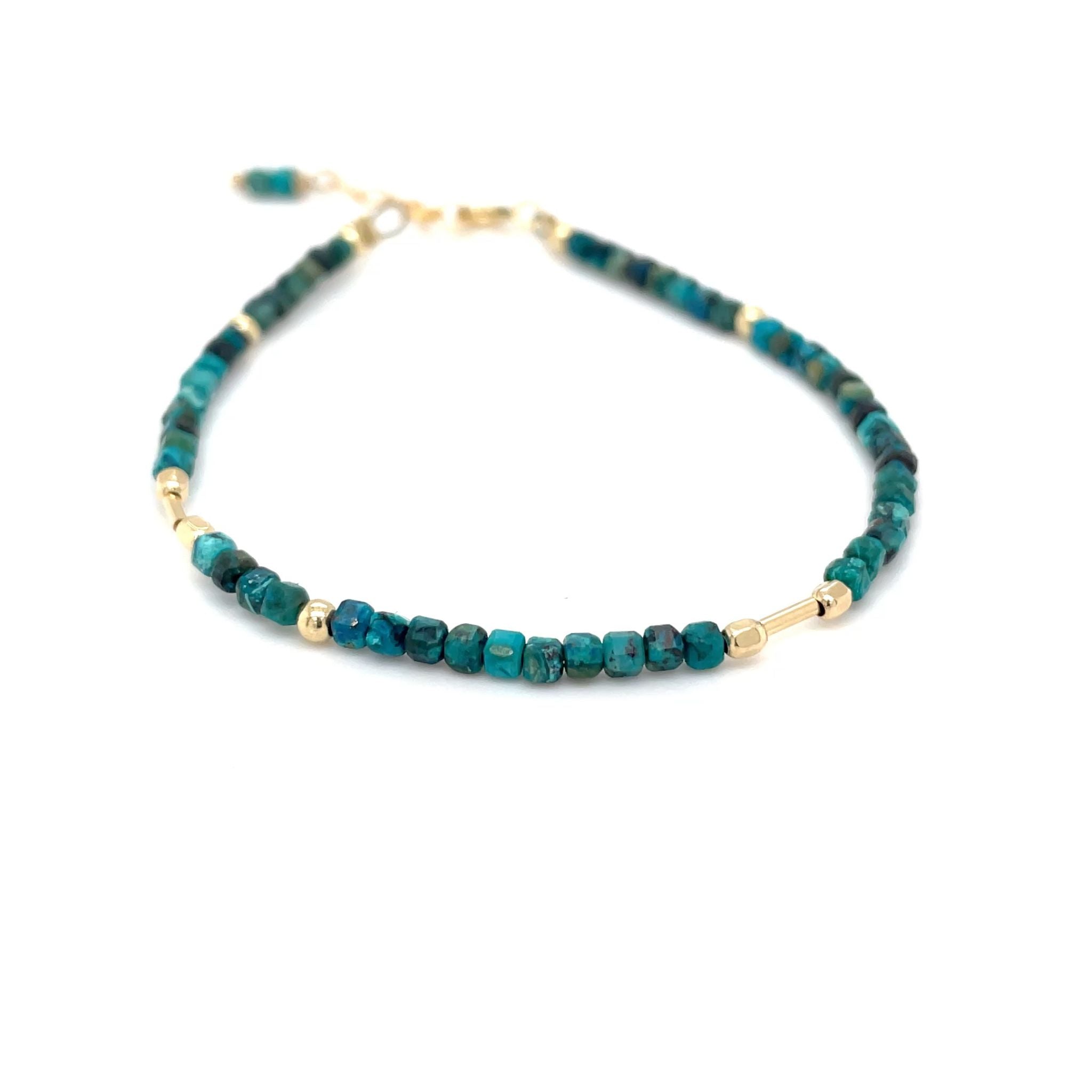 Ben je op zoek naar een mooie subtiele, maar net even anders dan anders armband? Kies dan voor deze prachtige vierkante blauwe apatiet kralen armband afgewerkt met gouden goldfilled kralen van Pat’s Jewels. Deze handgemaakte armband is door de kleine gouden buis kraaltjes weer net even anders dan anders.